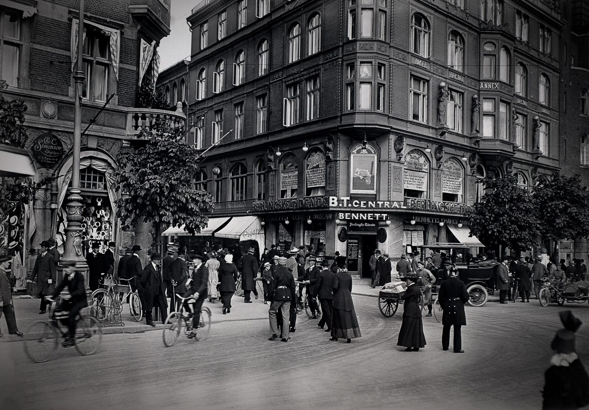 Dette billede er af Rådhuspladsen, som det så ud dengang i 1910. På højre hjørne ligger der i dag Burger King og på venstre side en 7-eleven.